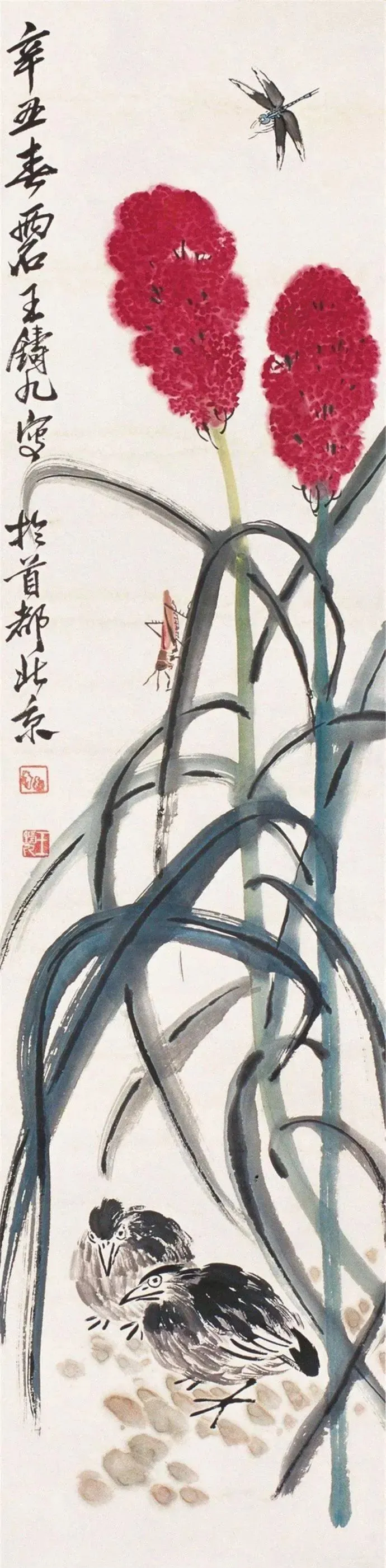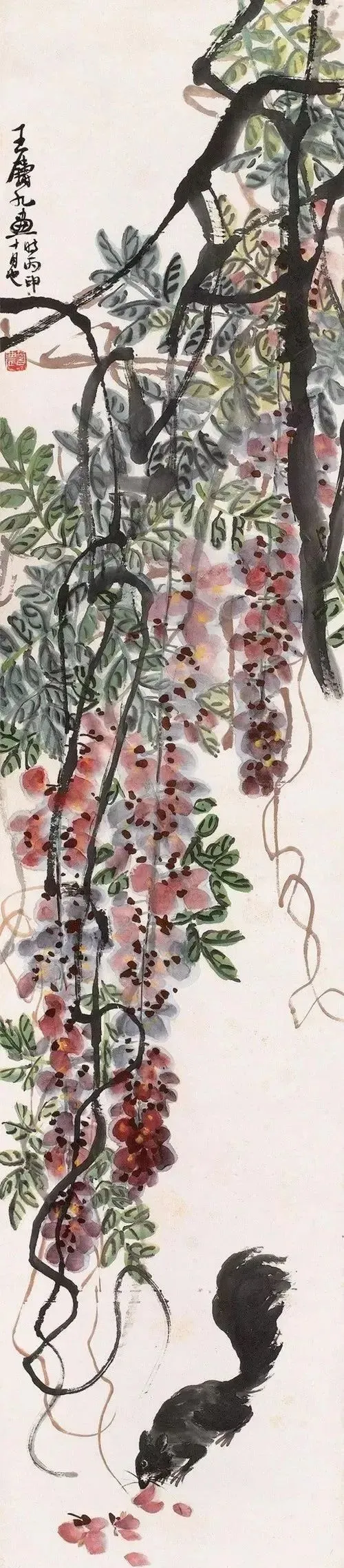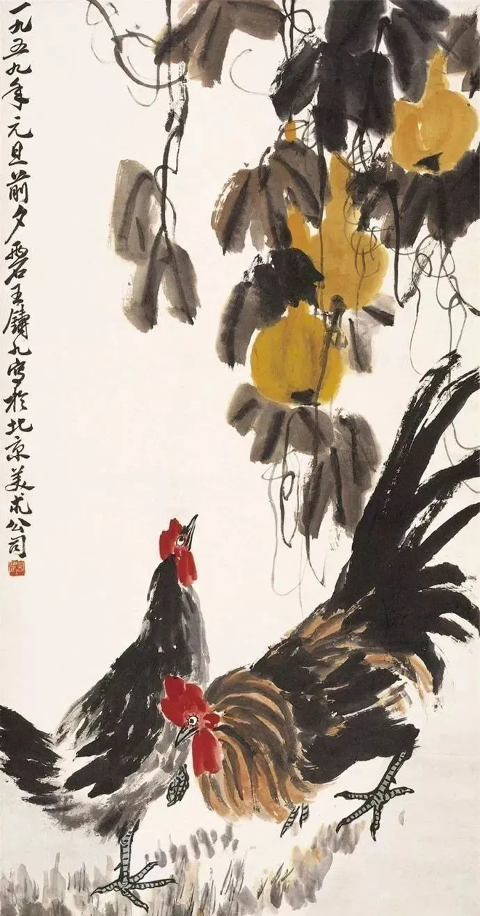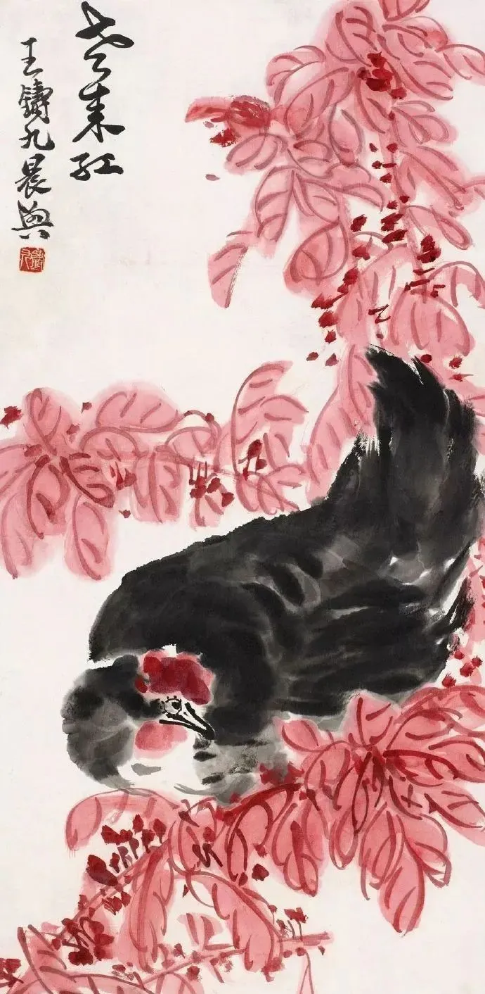 他画禽鸟更绝!雄鸡报晓,脖子伸得老长,鸡冠红得像要滴血,爪子抓地,像要蹦出来啄人;寒鸦归林,翅膀一扇,墨点飞溅,连羽毛的蓬松感都画出来了。最妙的是用色——红叶泼胭脂,乌鸡涂浓墨,对比强烈得像打翻了颜料盘,可凑近看,叶脉用淡墨勾,鸡冠点朱红,又和谐得像天生一对。
