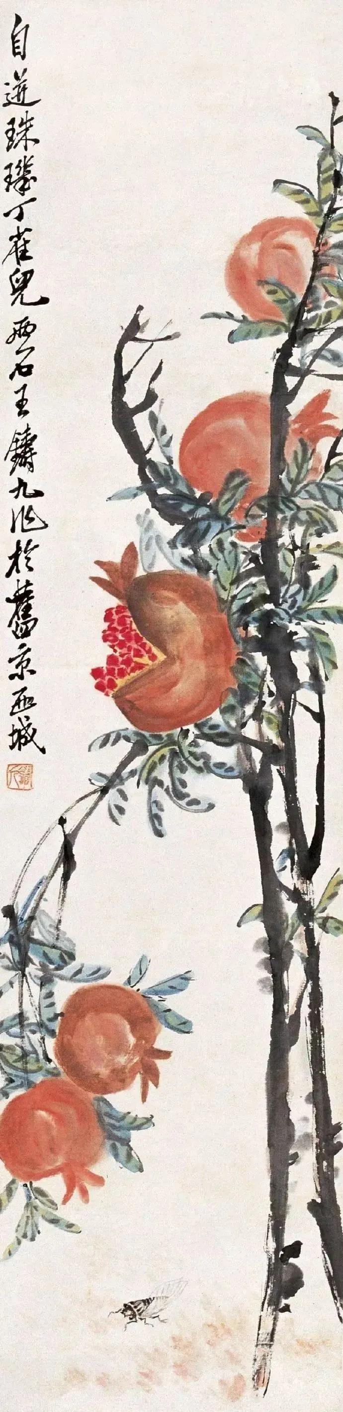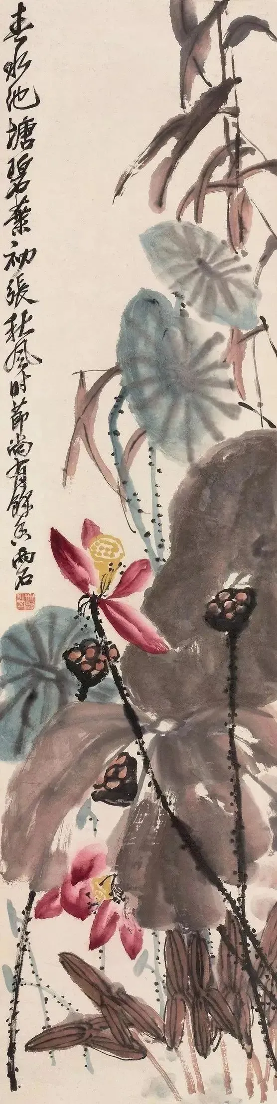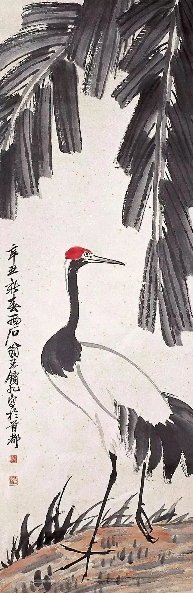他画禽鸟更绝!雄鸡报晓,脖子伸得老长,鸡冠红得像要滴血,爪子抓地,像要蹦出来啄人;寒鸦归林,翅膀一扇,墨点飞溅,连羽毛的蓬松感都画出来了。最妙的是用色——红叶泼胭脂,乌鸡涂浓墨,对比强烈得像打翻了颜料盘,可凑近看,叶脉用淡墨勾,鸡冠点朱红,又和谐得像天生一对。