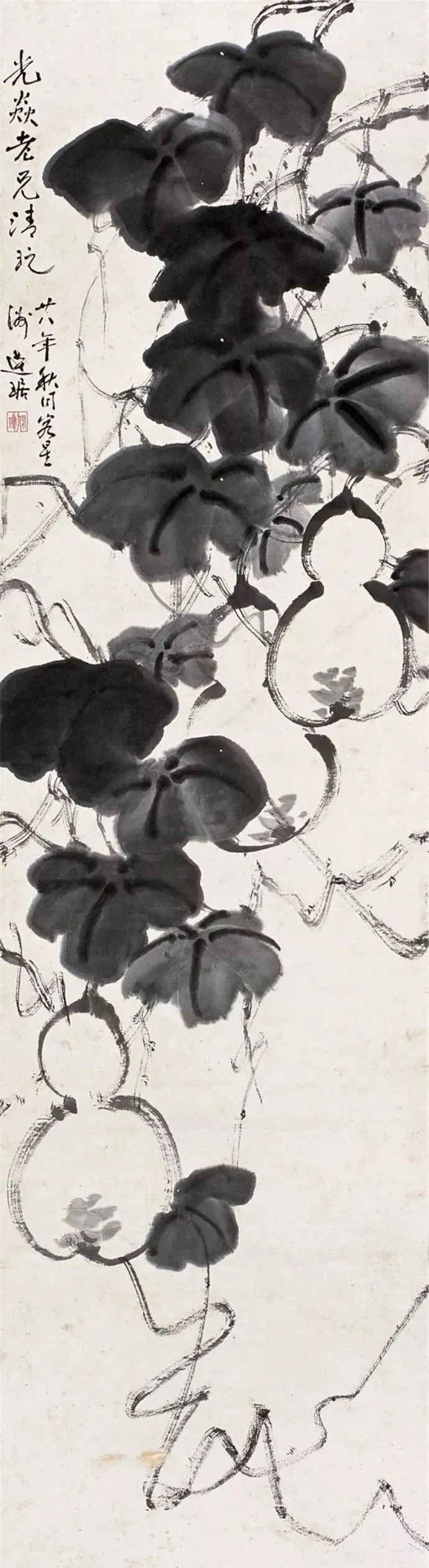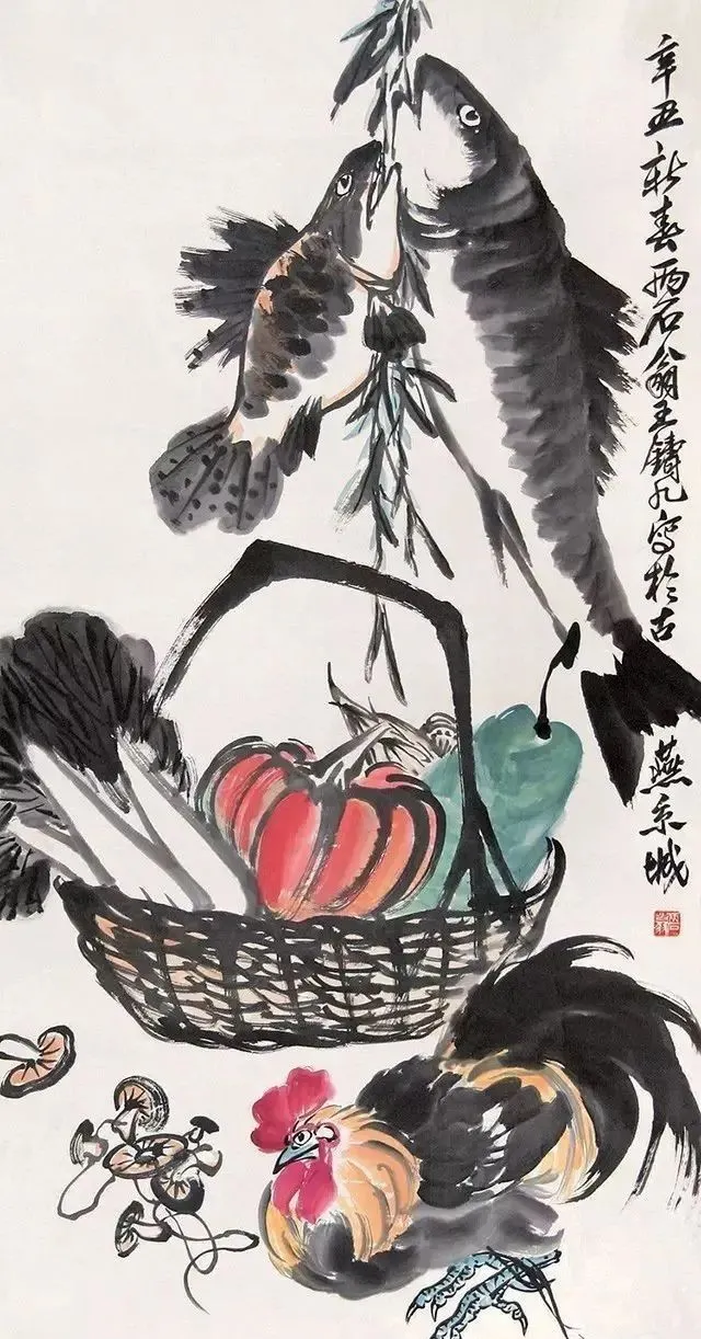 别人画牡丹,他偏画白菜、南瓜、谷穗,全是农家院里的“土玩意儿”。可经他笔墨一点,白菜根像铁铸的,菜叶翻卷得能听见风声,连谷穗都沉得压弯了腰,仿佛能摸到泥土里的温度。