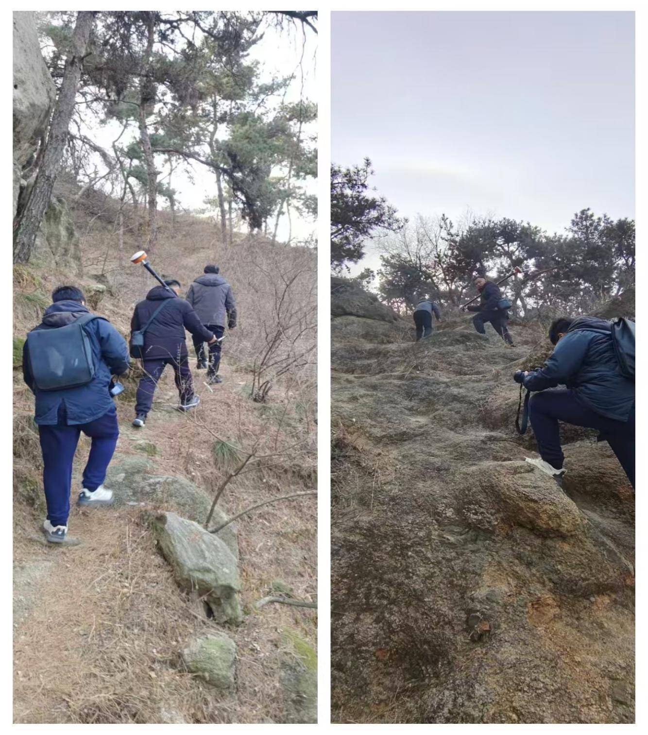 险峻的地理环境,更是对普查队员体力与意志的双重考验。钢城区境内山地丘陵广布,大量古山寨、古遗址分布在人迹罕至的山野之中,不少点位山势陡峭、荆棘丛生,根本无路可通。笔架山、青羊崮山寨与石墙群遗址是本次普查的重点复查点位,坐落于海拔近600米的山巅,上山的路全是碎石陡坡,稍有不慎便会滑落。为了完成现场核查,普查队员王广鑫、孙业勤每次进山都要扛着几斤重的设备,腰间别着开山刀随时劈砍荆棘开辟道路。
